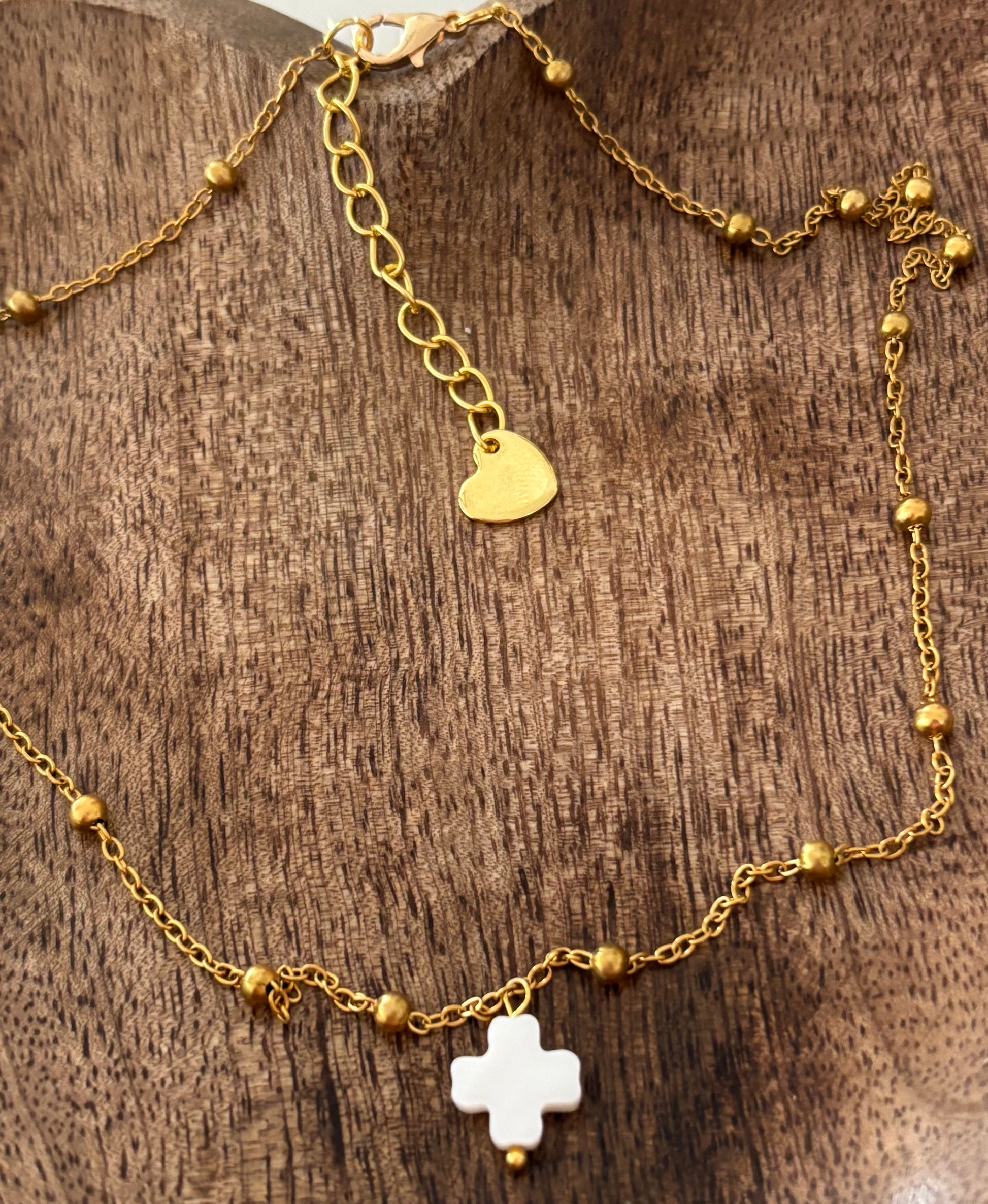 Le collier Marie est fait sur une chaîne dorée et se compose d'une croix nacrée.